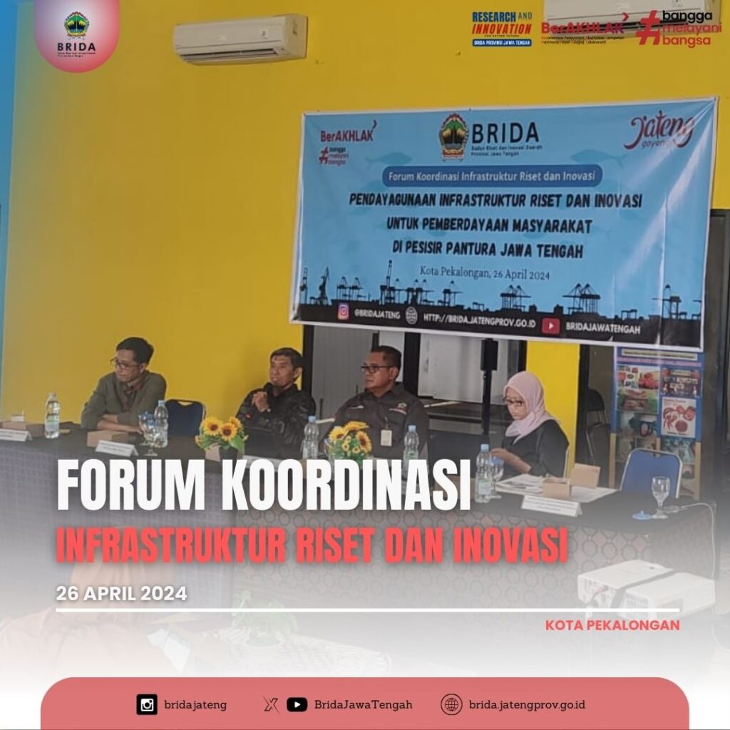 Kegiatan Forum Koordinasi Infrastruktur Riset dan Inovasi di Wilayah Pengembangan Petanglong – Bregasmalang mengangkat tema “Pendayagunaan Infrastruktur Riset dan Inovasi untuk Pemberdayaan Masyarakat di Pesisir Pantura Jawa Tengah” yang berlokasi di Technopark Perikanan Kota Pekalongan pada hari Jumat, 26 April 2024.